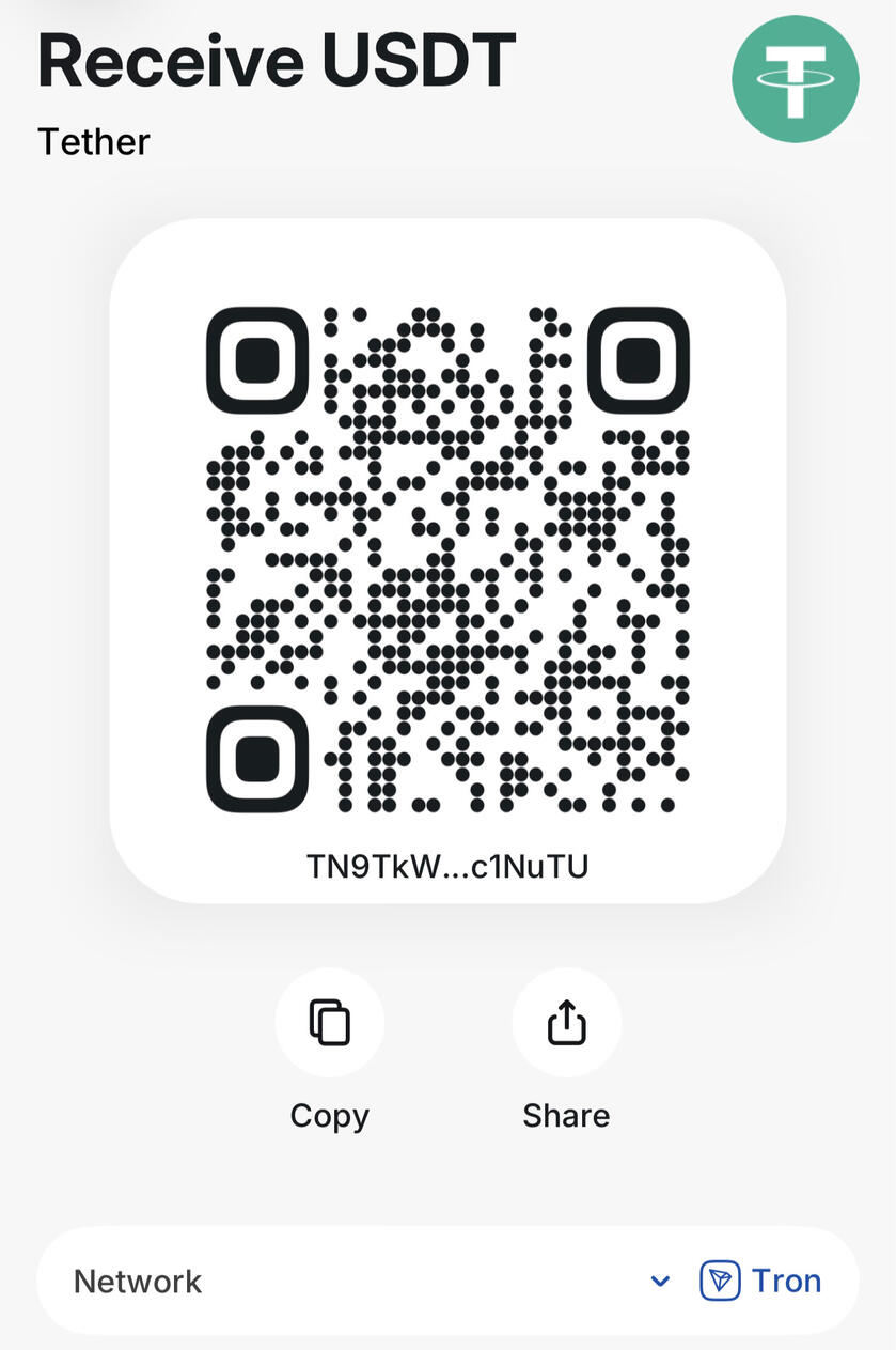 Hey, here's my address to receive USDT on Tron (TRC20) network: TN9TkWoZo3eKqFfqWy4vopJ6zBekc1NuTU